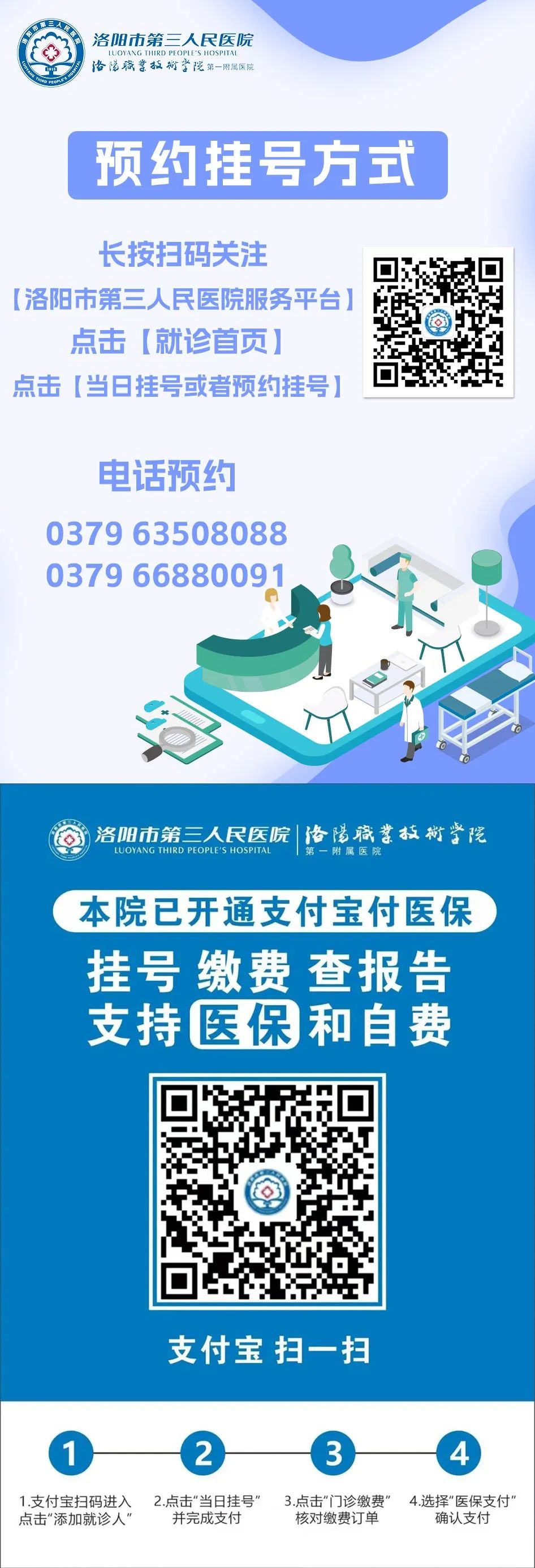 (1)、支付宝预约:扫码或者关注“洛阳市第三人民医院”后进行预约。
