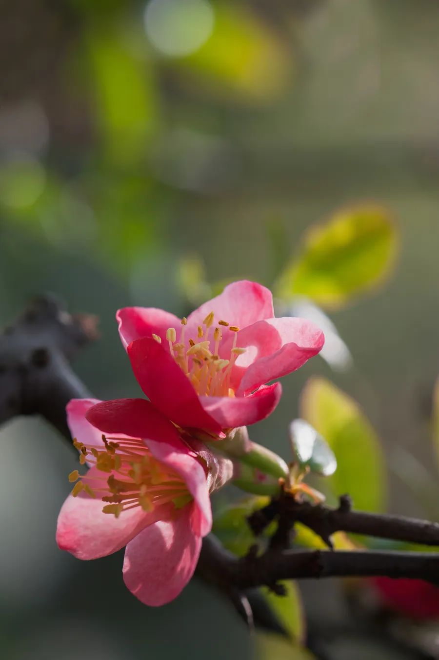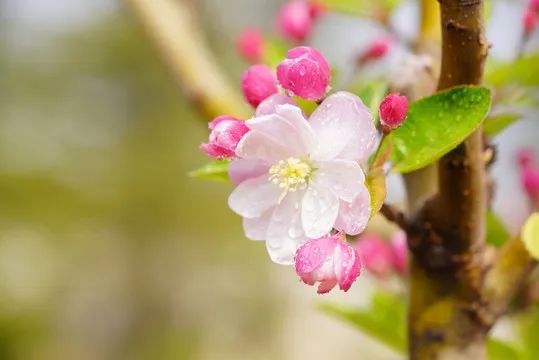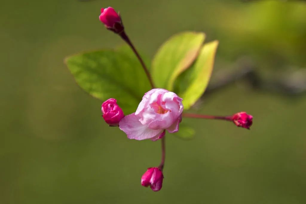 枝头上虽然挂满花蕾,但是叶子却刚刚生发,叶子仿佛很知趣,故意躲开了花儿的光彩。嫩绿的叶子抽出花枝头,需仔细方能辨识,可能是因为离得太近的缘故吧,于是抬头看远处的那三株,果然绿光比眼前的“浓”,这难道就是“草色遥看近却无”的意境,再看那含苞待放的花骨朵儿,这时在阳光的照耀下愈发娇嫩,红中带着一丝“可爱”,恍然间觉得像是一株一株挂满枝头的樱桃,真想摘一个放在嘴里,吃是有点“造次”了,闻闻还是可以的,于是想凑上去闻个花香,却才发现自己还戴着口罩呢,不禁哂然一笑,闻不到“她们”的香气却可以看到她的“身体”,这待放的花朵如胭脂点点,有的已经微微开口了—“樱桃小口”,可见其花瓣大约有七、八瓣左右,中间是黄色的花丝,花丛尽头花粉已经初具“规模”,单等怒放之时的蜜蜂和蝴蝶了吧,可能我到的时候不是“她”的约会时间,所以一个昆虫也没有见到,只有春风时不时和海棠花来个亲密接触。著名的“二月春风似剪刀”家喻户晓,那“三月春风”呢,像“白马王子”还是“情场高手”,竟惹得春中“美女”竞折腰,“士为知己者死,女为悦己者容”,这花儿大概都是为她心目中的“白马王子”次第开放的吧。
