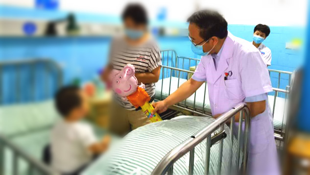 “六一”上午一上班,院长杨致远、副院长马辉、工会主席段言文就带领相关人员来到儿科和康复医学科儿童病区,看望慰问节日住院的小患者,并为他们送上了节日礼物。