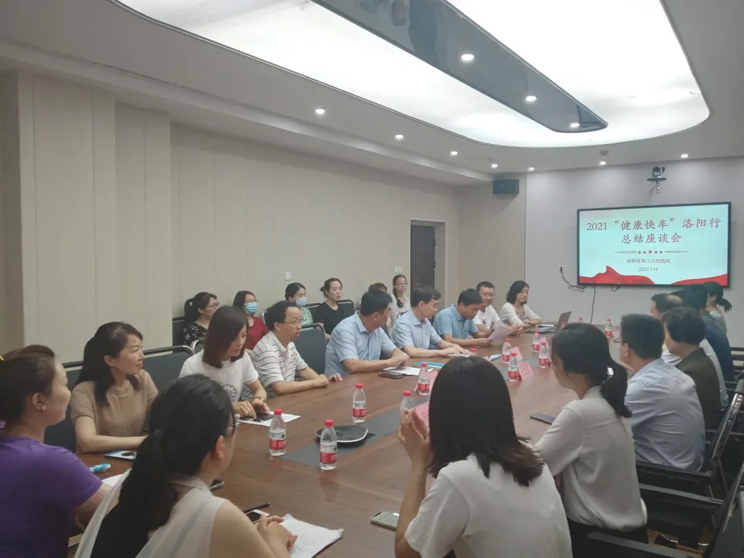 7月14日下午,洛阳市第三人民医院召开2021“健康快车”总结座谈会,卫健委领导、健康快车全体人员、基地医院领导及医院参与快车活动的工作人员参加了座谈会,对健康快车洛阳行工作进行总结,与会人员共同回顾了健康快车在洛期间的工作和感受,为本次“健康快车”洛阳行活动画上圆满句号。