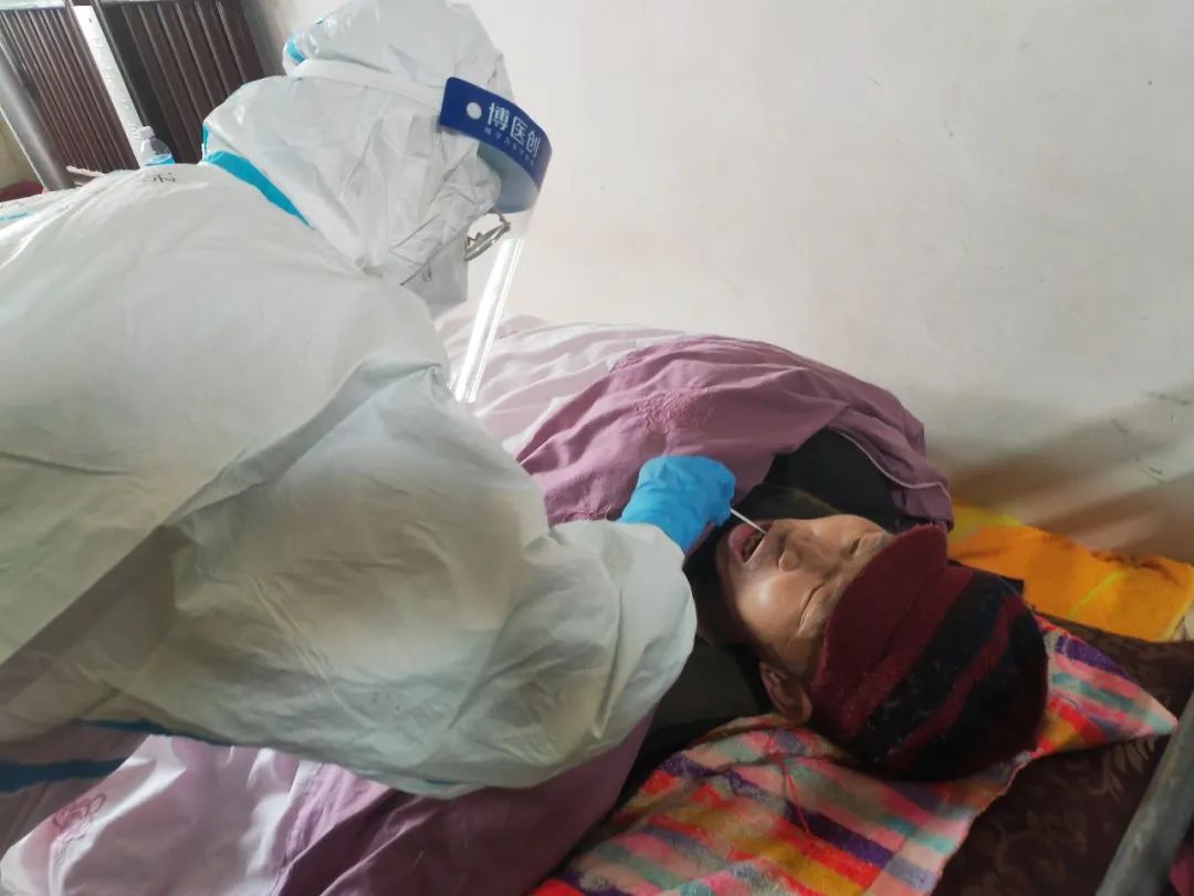 天寒地冻、山路崎岖,医务人员穿着防护服步履艰难地进村入户为卧床村民和居家隔离人员上门采样。