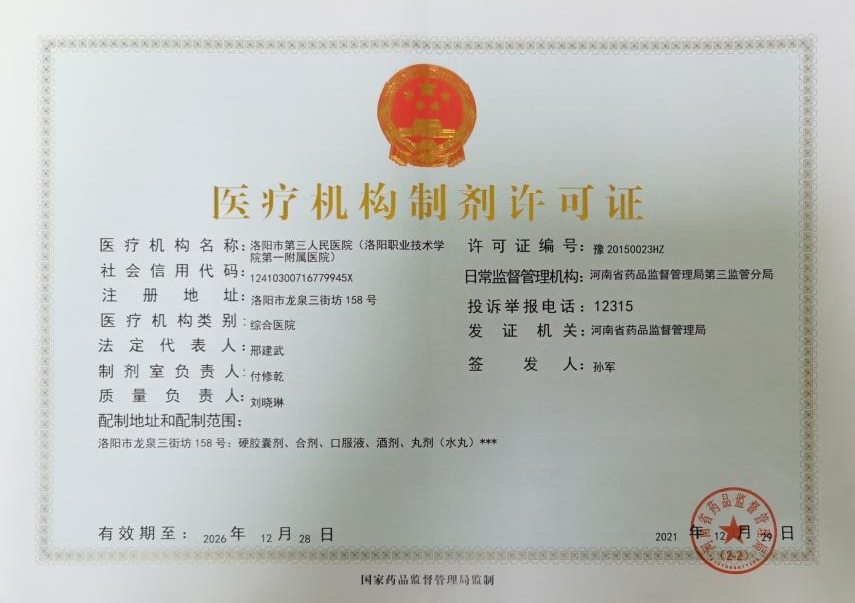 12月16日,在洛阳市市场监督管理局审批科组织下,药品安全监管科张定佳科长带领检查组一行4人,对洛阳市第三人民医院制剂室进行了现场检查,经过专家组严谨、公正的评审,我院制剂室通过现场验收,同时取得《医疗机构制剂许可证》。