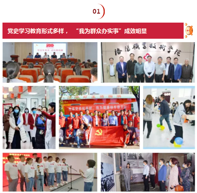 我院多举措“学党史、悟思想、办实事、开新局”。党政工团结合各自实际,通过组织党员干部职工到红色教育基地参观学习、重温入党誓词、职工摄影比赛、讲好英雄故事、知识竞赛、诵读红色经典、读书分享、重温烈士家书等活动,营造“学、思、践、悟”氛围,院工会被省总工会授予“全省模范职工之家”荣誉称号。结合行业特点和医院实际,聚焦群众看病就医“急难愁盼”问题,落实提升医疗服务十大举措,整合、优化患者综合服务中心,努力打造“无陪护医院”;积极开展健康管理中心标准化、规范化建设,被大河报评为河南省“区域影响力十佳健康管理中心”、“最具创新力十佳健康管理中心”;部署开展“随手拍、立即传、马上办”活动、院内环境形象提升行动、社区医院中医馆建成、在学院开设综合门诊部为师生服务等重点实事项目,群众就医感受持续改善。