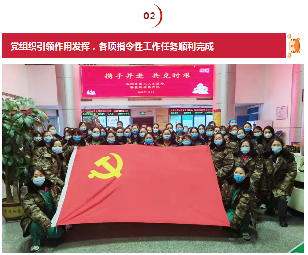 在疫情防控、援边援外、无偿献血、疫苗接种等各项指令性工作中,院党委充分发挥核心作用,党支部积极发挥战斗堡垒作用,党员切实发挥模范引领作用。为打赢疫情阻击战,坚持弘扬伟大的抗疫精神,对外不讲价钱,组建核酸采样队伍,坚决完成应急任务;对内不讲困难,新建发热门诊,改建预检分诊通道,调整、扩建核酸检测采样点;对社区不讲条件,承担辖区隔离点任务和重点人群居家健康监测。在援赞援疆、增援郑州等地市的抗疫工作中,上百名党员骨干、医务工作者,主动报名积极参战,克难攻坚,无私奉献。在义务献血活动中,党员干部率先垂范,总献血量达4万多毫升,受到市献血办的点名表扬。