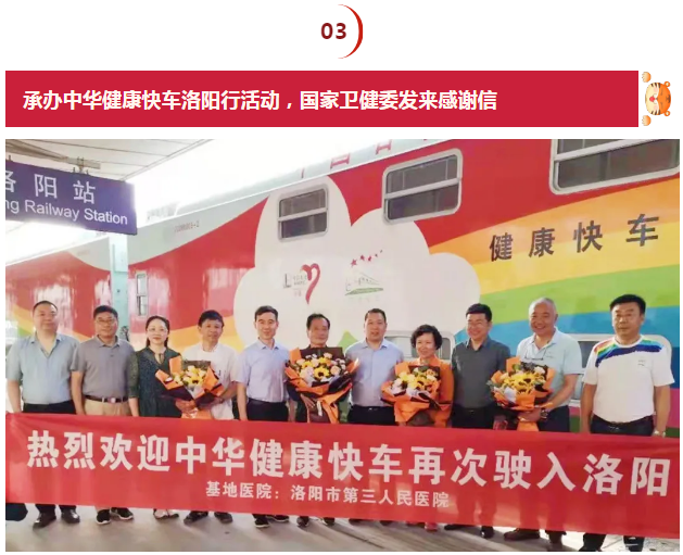 我院再次承办了健康快车洛阳行活动,从5月9日,满载着光明与希望的彩虹列车——中华“健康快车”停靠洛阳,至7月13日止,共为1093名白内障患者免费实施了复明手术,让他们重又清晰地看见了五彩缤纷的世界。期间,中华健康快车基金会、市政府和省卫健委领导到我院探访慰问,为医院赢得了荣誉,被社会赞誉为“明亮了一双眼睛,幸福了一个家庭,和谐了一座城市。”国家卫健委国际交流与合作中心发来了感谢信,对我院所作的工作予以充分的肯定。
