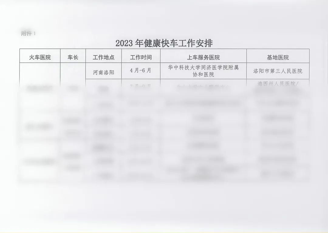 我院曾于2010年、2012年、2021年作为基地医院承办了国家卫健委中华“健康快车”洛阳行活动。为全市3700余名白内障患者免费实施了手术,得到了社会的赞誉。2023年我院再次成为健康快车基地医院,与华中科技大学同济医学院附属协和医院专家团队共同为1000余名白内障患者免费实施复明手术。