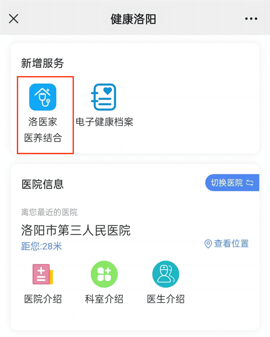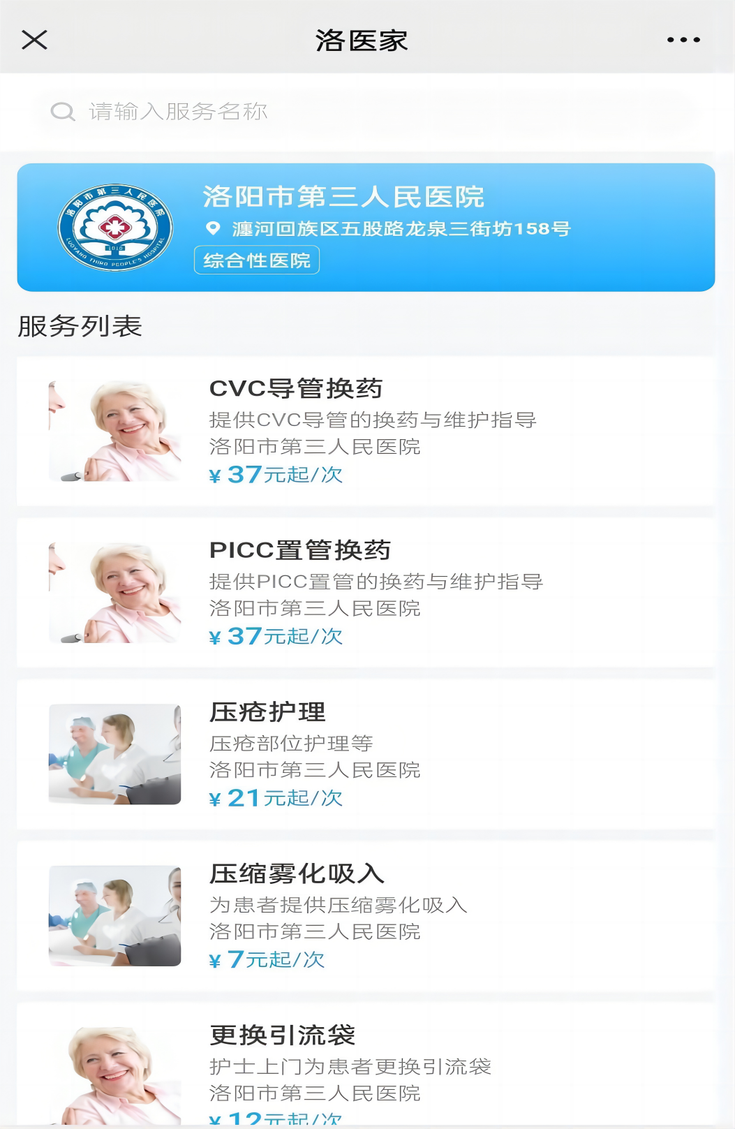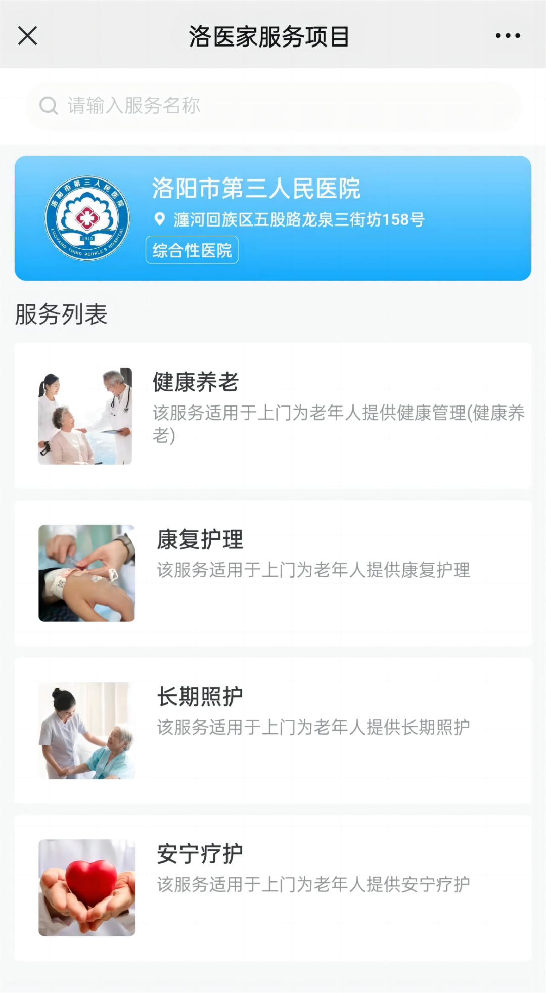 由洛阳市卫生健康委员会建立的“洛医家”服务管理平台,组建医养结合医护服务团队,采用“线上线下”菜单式服务和“医疗服务价格 上门服务费”收费,与居家社区老年人签订个性化服务协议,建立契约关系,上门为居家社区老年人提供健康管理(健康养老)、疾病诊治、康复护理、长期照护、安宁疗护等服务。