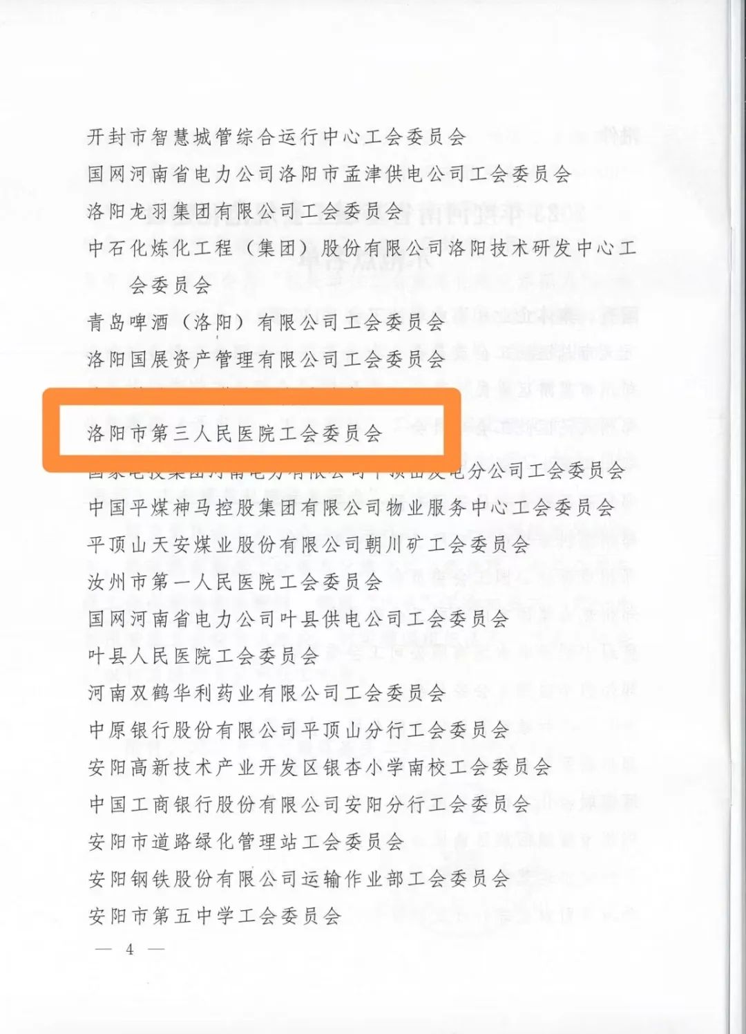 近日,从市总工会传来喜讯,洛阳市第三人民医院被河南省总工会授予“2023年度河南省基层工会规范化建设示范点”荣誉称号,这是洛阳市唯一一家获此殊荣的医院。