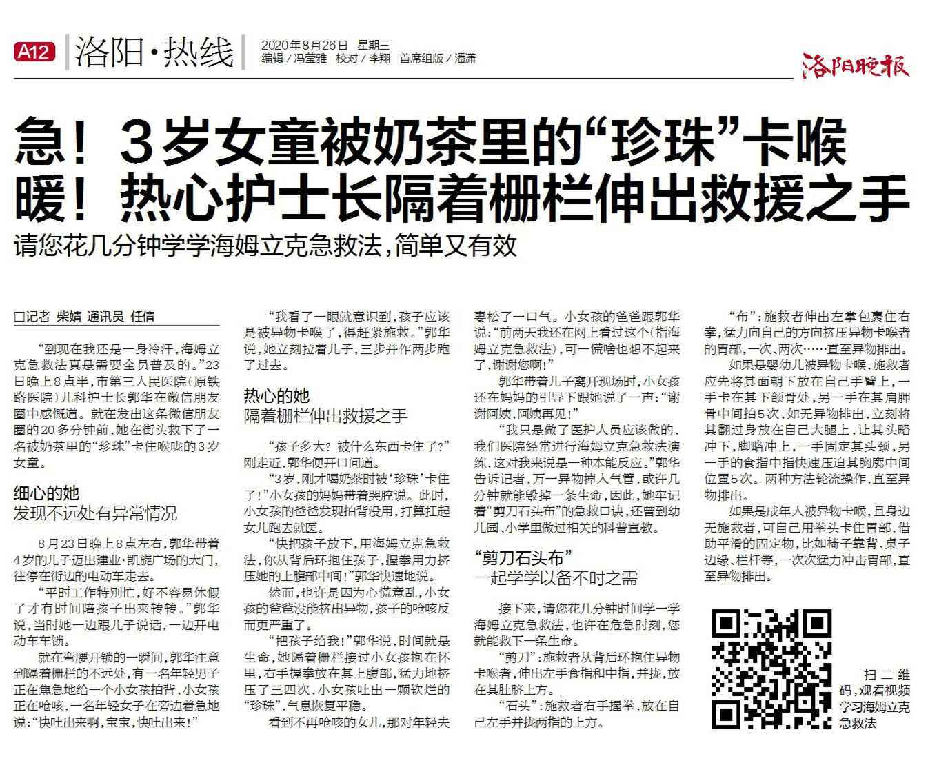 《洛阳晚报》:急!3岁女童被奶茶里的“珍珠”卡喉 暖!热心护士长隔着栏栅伸出救援之手
