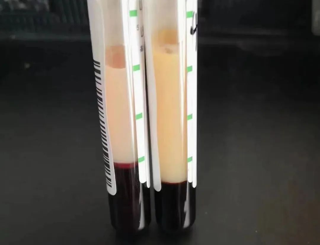在给于先生进行血液检验时,检验人员发现:血液经过离心之后,上层悬浮着油脂样的物质,颜色如同“牛奶”一般,是典型的“乳糜血”。