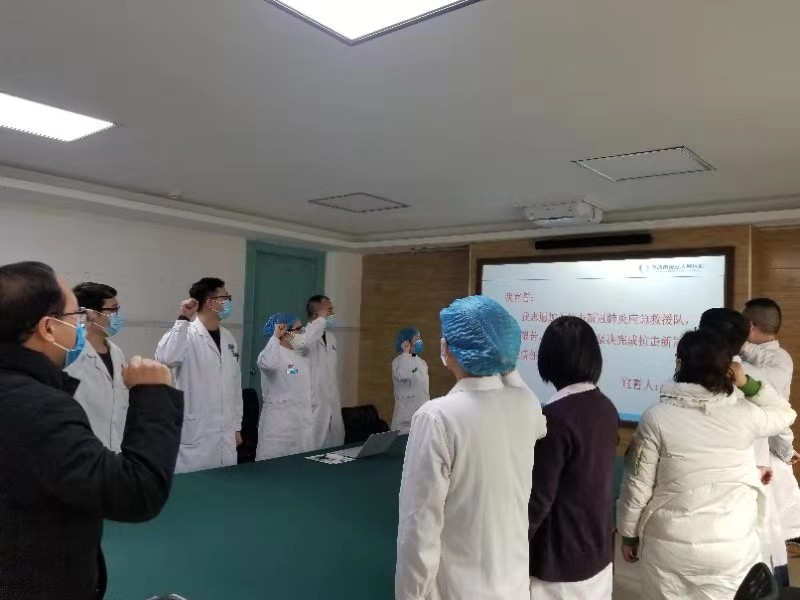培训班结束后,杨致远院长、马辉副院长、支部书记王继华、护理部主任陈春霞、医务部副主任张宇飞、我院“新型肺炎”技术指导组专家、抗击”新型冠状病毒感染的肺炎”应急救援队第一梯队医护人员举行了宣誓会。