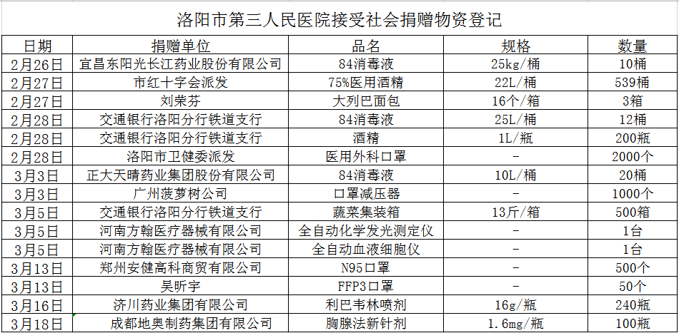 3月5日,交通银行洛阳分行铁道支行捐赠500箱规格为13斤的蔬菜集装箱;河南方翰医疗器械有限公司捐赠1台全自动化学发光测定仪和1台全自动血液细胞仪。