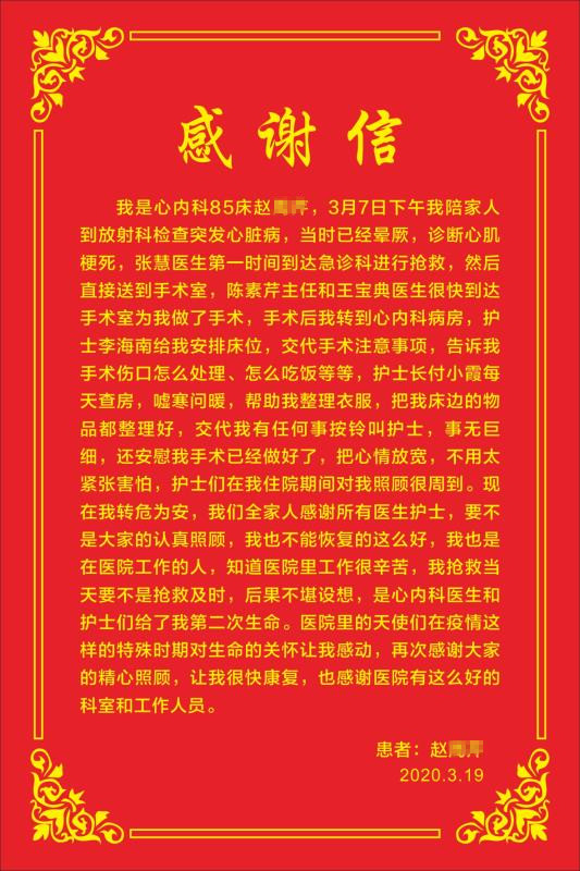 出院那天早上,赵阿姨专门拉着付小霞护士长的手,郑重地递给护士长一封信,并说道:“护士长,我今天要出院了,感谢你们的精心照顾,我是个心思敏感的人,可是我在这里却感受到了如家般舒适温馨,住院那天晚上我因为紧张,我的手都不敢动,可爱的小护士就来这里给我安慰,给我耐心解释让我安心,第二天我穿的太厚,出了一身汗,脸通红,家人都没注意到,亚楠护士长细心的发现,并问我有什么不舒服,给我找来了干净的病号服还协助我换上,还有你们每天早上来查房,温暖的笑容都让我感到异常安心还有很多……昨天亚楠护士长还教我八段锦,为我更快的回归正常生活提供了保证,我回家也会按时练习的。还有好多人,我都不记得名字了,但是她们的面孔深深印在了我的脑海,此刻我只能用我朴素的语言文字来表达了,我文化程度不高,我的字写的不好看,我已经写了三遍了,这是最工整的一张,真心感谢心内科的医生护士。你们就是给我第二次生命的家人,真的很感谢,千言万语就是谢谢、谢谢!”付小霞护士长双手接过这封这封信,这封一笔一划,工工整整的写了满满一整张纸的信,看得出,每一笔都是给我们的真心感谢和暖心鼓舞。