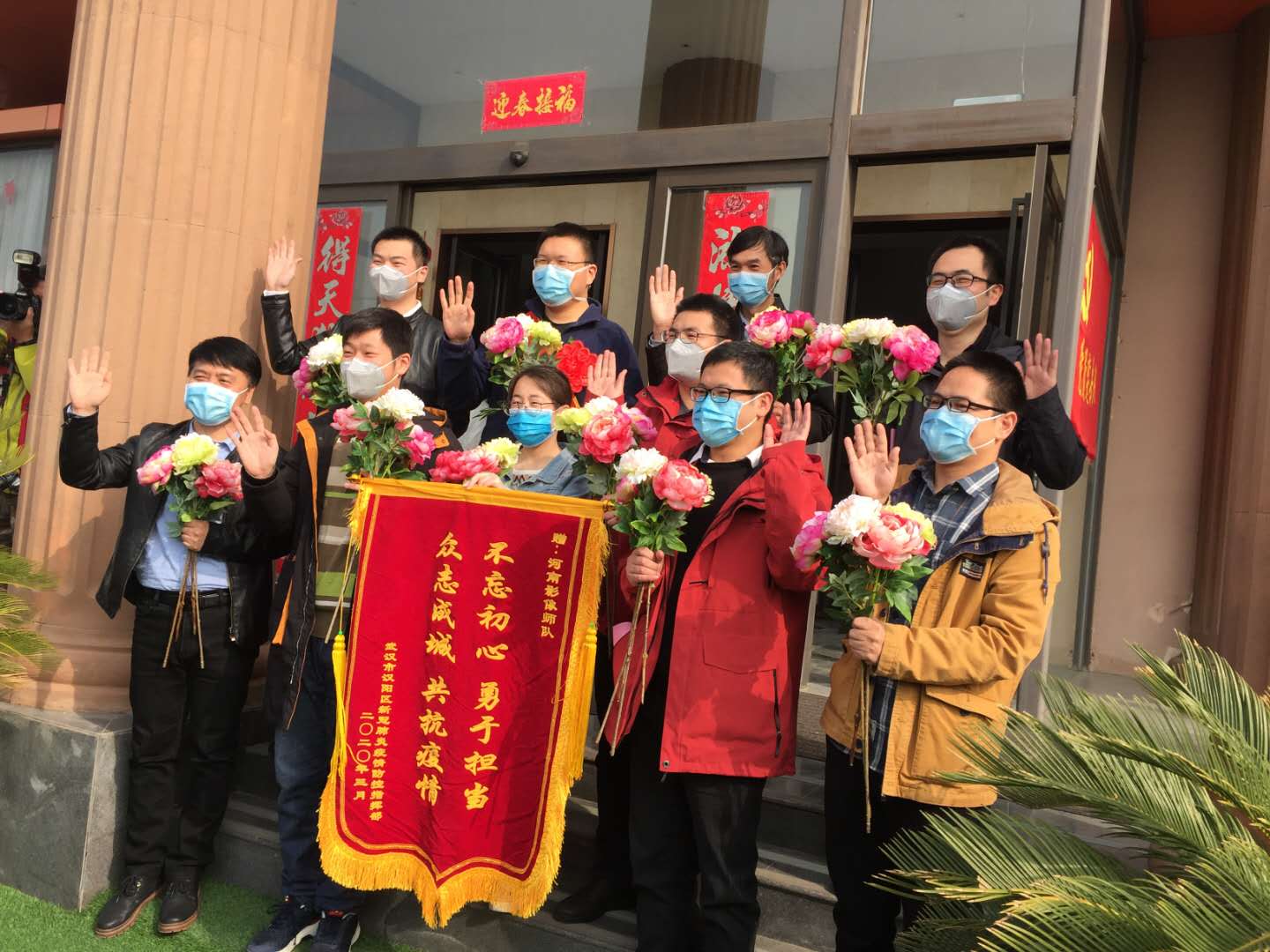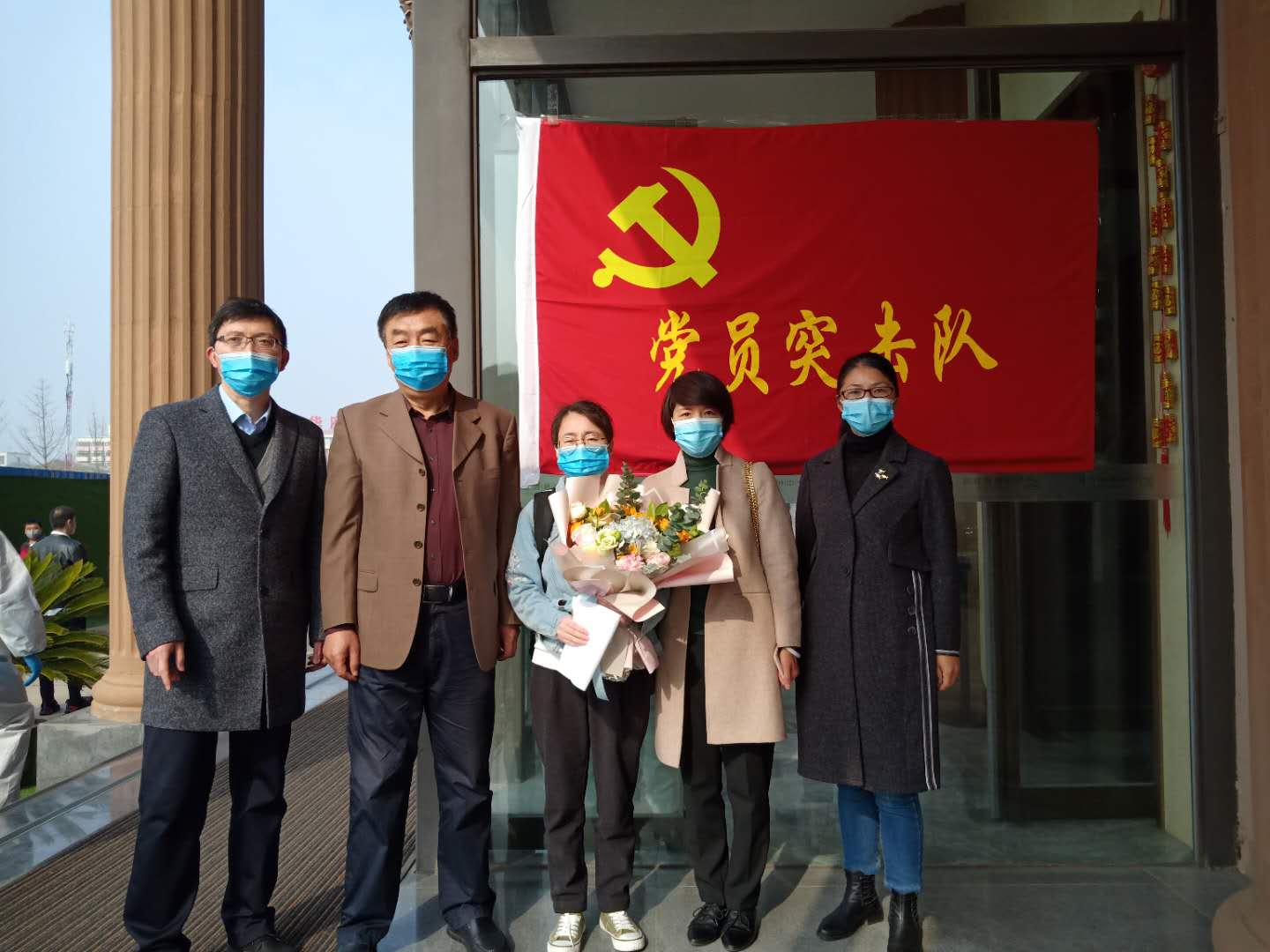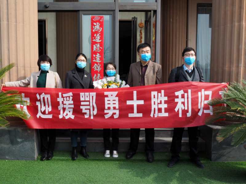 4月3日上午9时,洛阳市第三人民医院援鄂医疗队员赵红梅解除了隔离,与等候在外来迎接她凯旋的医院同事们见了面,院工会主席段言文为她献上了鲜花。见到分别40天的同事们,赵红梅与一起来迎接她的门诊部主任丁雪、门诊党支部组织委员兀利红、影像科主任王庆兵亲切交流。