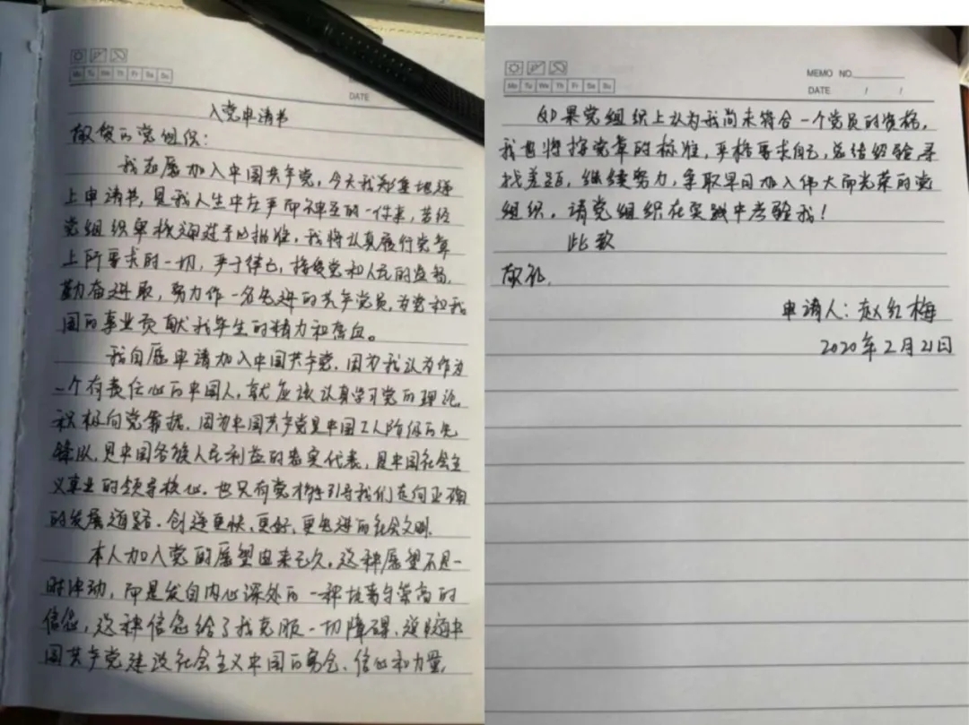 为充分发挥党支部的战斗堡垒作用,省卫健委党委同意成立以河南省援鄂第十三批医疗队的12名同志组成的临时党支部。赵红梅也第一时间写了入党申请书,并通过上级同意,火线入党。方舱医院内,每班工作时间约7-8小时。但从出发、穿脱防护服、交接班,算下来就要8,9个小时。长时间的高压工作,队员们身体和内心都很疲惫。但赵红梅深知每一张片子都关乎疫情,再繁琐、再累,也必须认认真真做好,为患者的诊断把好关。让赵红梅觉得温暖的,是来自医院和家乡的支持。初到武汉,疫区防疫物资匮乏,身后的洛阳市第三人民医院为她准备了充足的防护用品。父母远在甘肃老家,身体不好,当地的领导登门慰问,帮助解决实际困难。这些都让赵红梅感受到了党的关怀。
