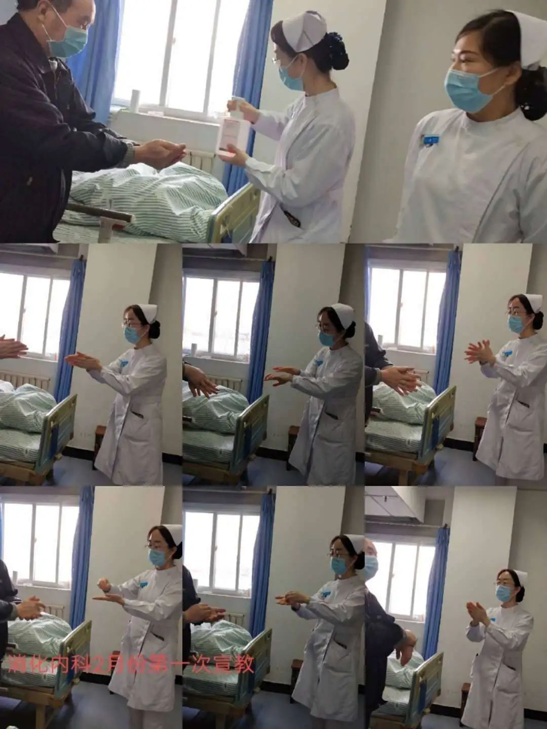 疫情期间,消化内科的护士们开展一对一的服务,从基础做起,手把手的教大家“口罩的正确佩戴方法”、“废弃口罩如何处理”、“正确的七步洗手法”。
