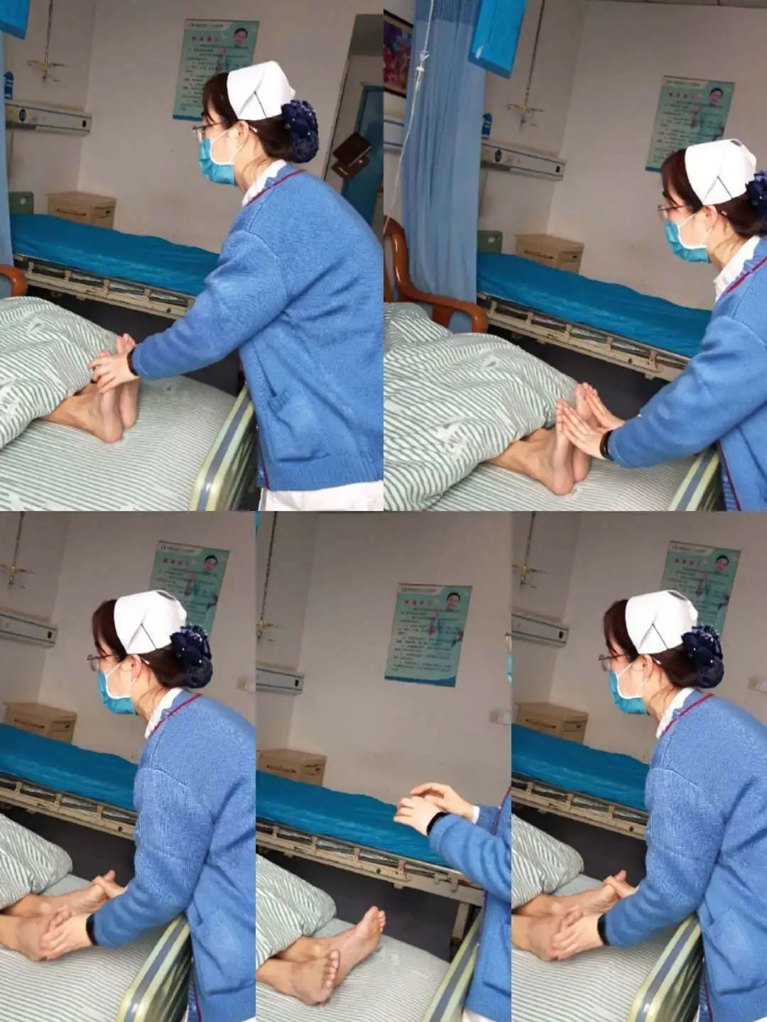 这是一位做了“肝动脉栓塞化疗手术”术后的病人,为了防止股动脉穿刺点有渗血、肿胀,因此需要术肢制动24小时,制动的时间太久,患者会感到不舒服,护士正在指导患者如何做脚部的“伸展”运动,改善末梢循环,在病情允许的范围内提高患者的舒适度。