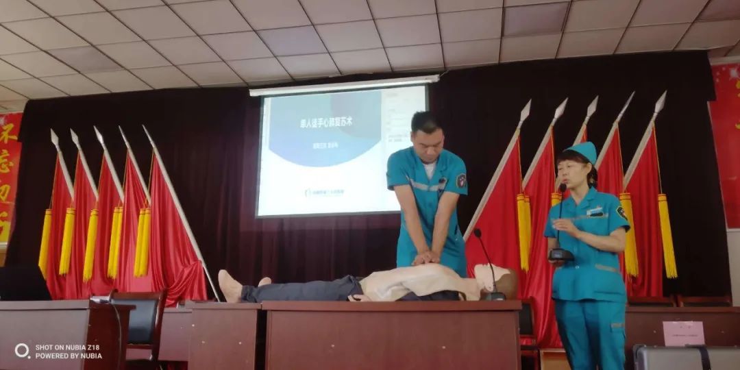 由我院社会工作部牵头,与急诊科付主任团队在林业职业技术学院、旭升村委会、五股路办事处,利用人体模型现场进行徒手心肺复苏演练,并将大家分成小组,手把手指导在场人员进行单人徒手心肺复苏术、创伤患者包扎止血术、海姆立克急救法等急救措施。