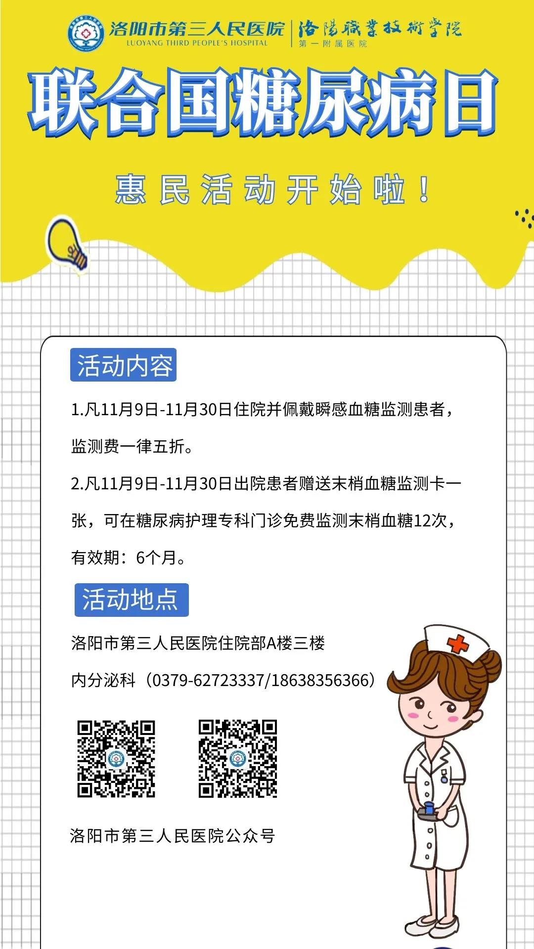 2020年11月14日,是第14个“联合国糖尿病日”,为积极倡导健康生活方式,重视预防为主,提高全民健康意识和健康素养,洛阳市第三人民医院将开展一系列惠民活动。