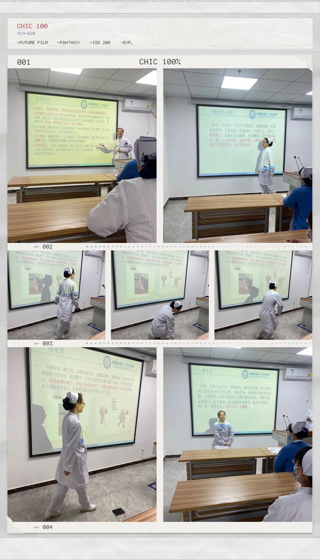 接着由张文敏护长给大家示范:见面礼仪,坐姿,行走,下蹲姿势,还有电话铃响,我们要微笑通话,因为微笑不分四季,不论南北,只要有人的地方,微笑之花就会绽放。