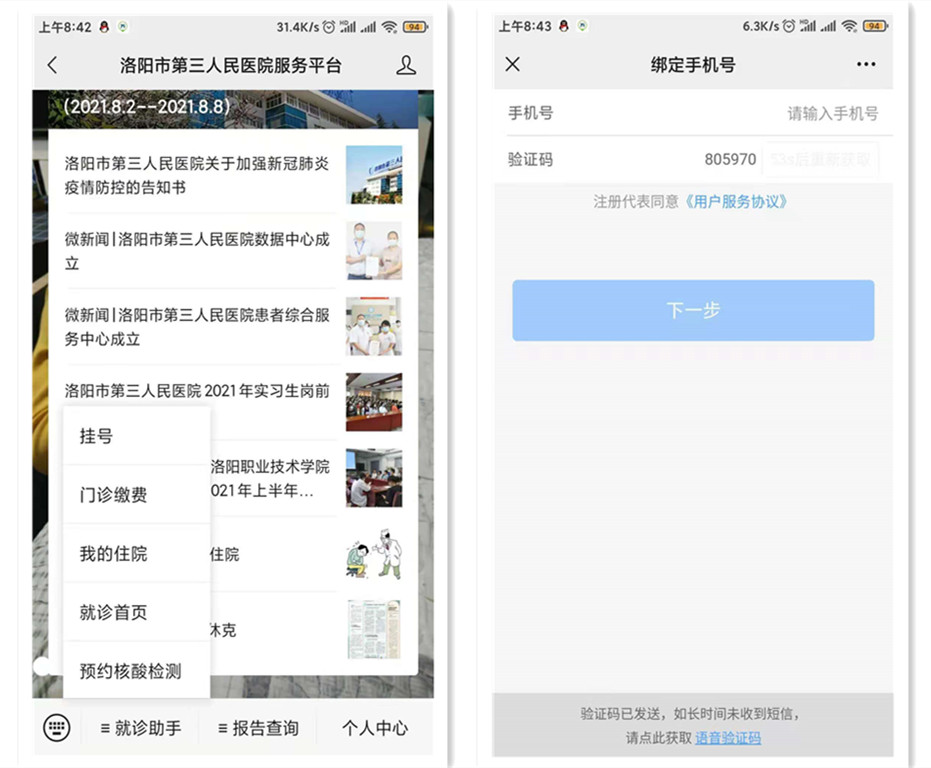 1.微信搜索“洛阳市第三人民医院服务平台”微信公众号→点击“服务”→进入“就诊首页”→点击“预约核酸检测”→绑定手机号,完善个人信息。