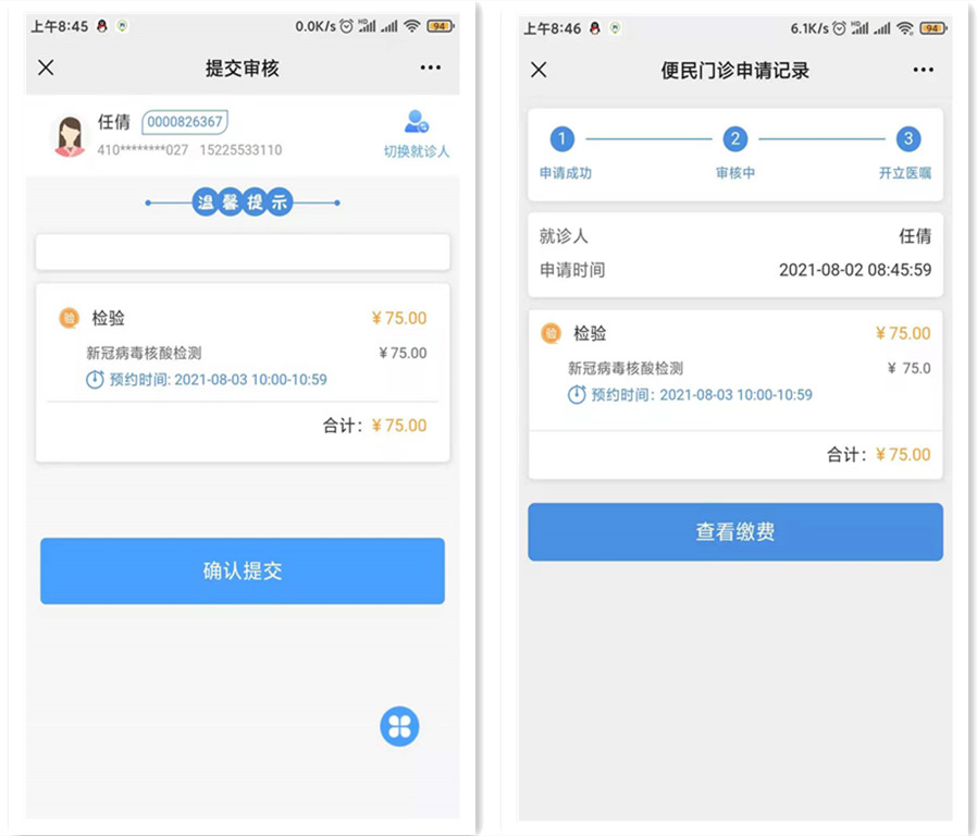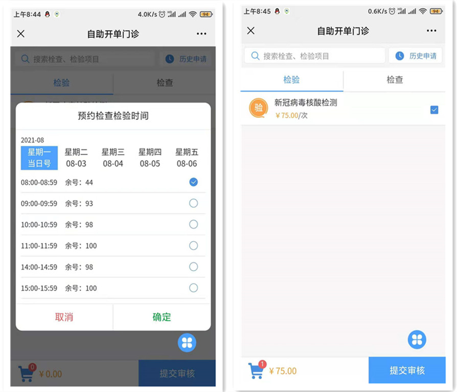 3.选择检验时间→提交审核→确认提交→查看缴费→支付