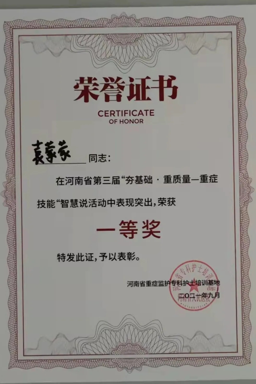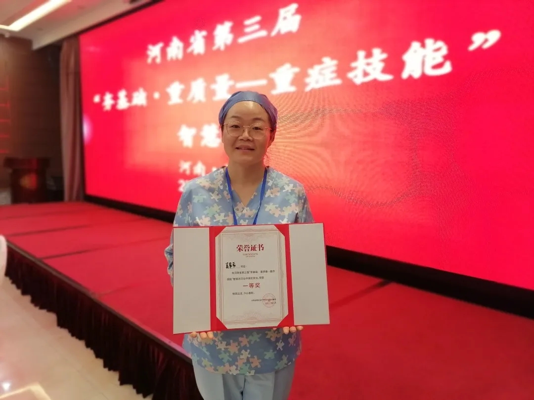 9月28日,在郑州市举办的“河南省第三届‘夯基础?重质量—重症技能’智慧说”活动中,我院选手袁蒙蒙获得一等奖的好成绩!