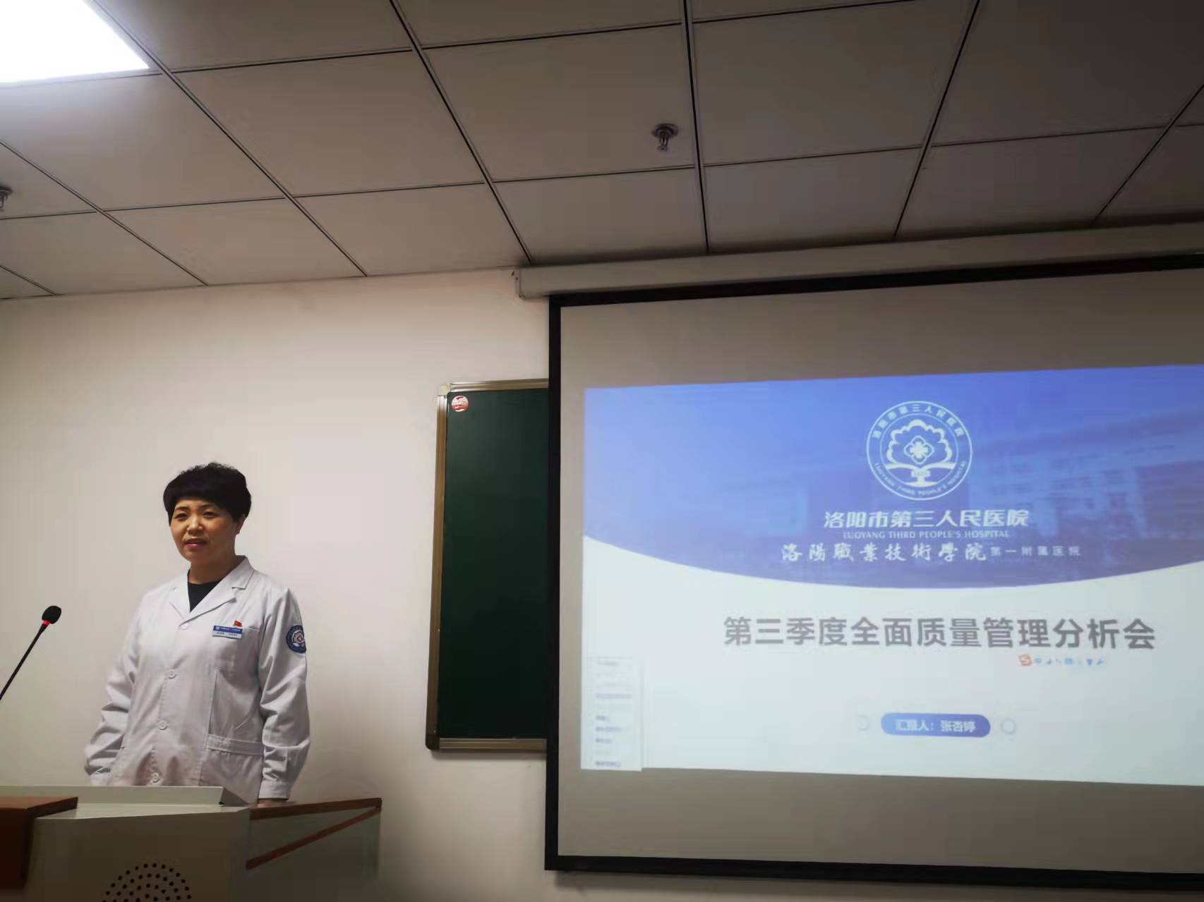 10月21日14时30分张杏婷副主任在模拟实训楼103室主持召开第三季度全面质量管理考核分析会,主管副院长郭建峰、相关部室主任及骨干参加了本次会议。