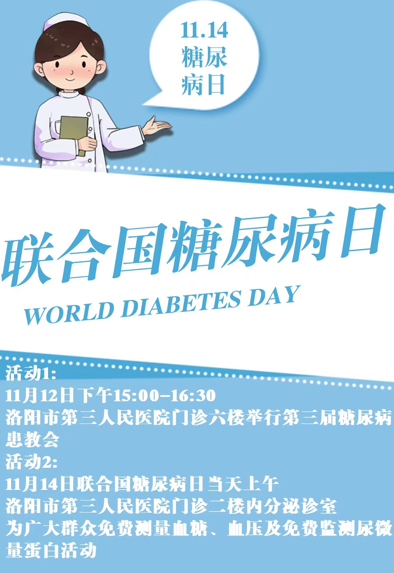 活动内容:免费测量血糖(需空腹)、血压及免费监测尿微量蛋白