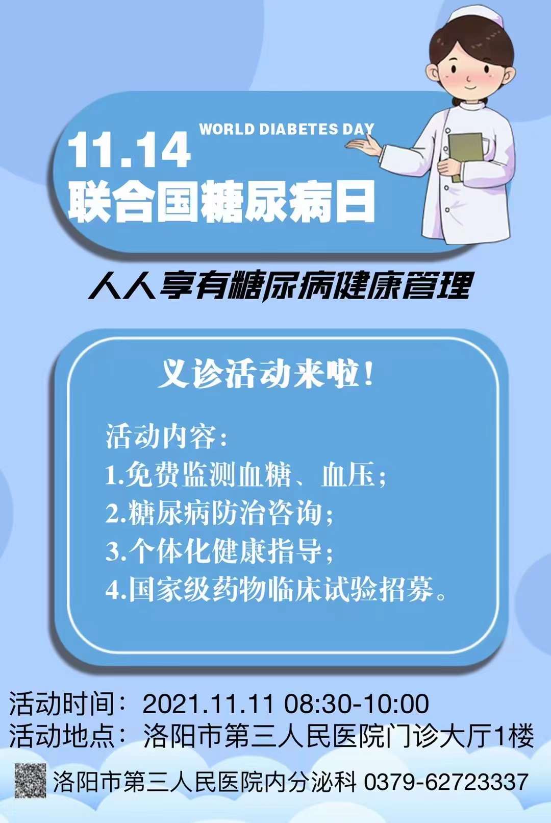 2021年11月14日是第15个“联合国糖尿病日”,今年的主题为“人人享有糖尿病健康管理”。为唤起全社会对糖尿病防治的重视,洛阳市第三人民医院内分泌科特举办一系列“关爱‘糖’友”惠民义诊活动。