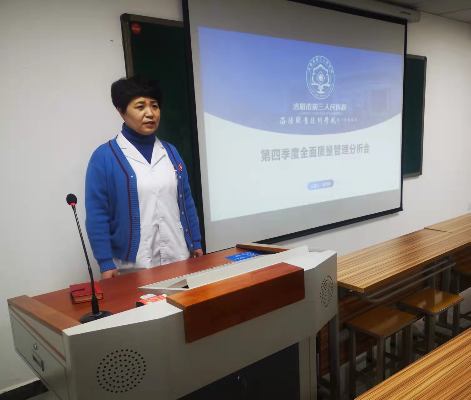 1月20日14时30分质管科张杏婷副主任在模拟实训楼103室主持召开第四季度全面质量管理及各质量与安全管理委员会扩大会议,主管副院长郭建峰、相关部室主任及质量与安全管理委员会成员参加了本次会议。