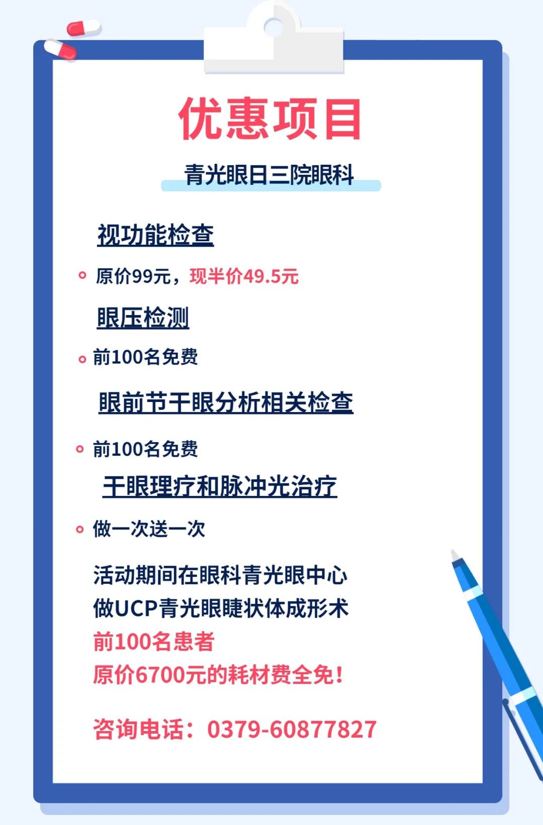 为了让青光眼患者能及早发现疾病,及时干预治疗,洛阳市第三人民医院眼科推出了眼压检测、UCP超声睫状体成形术的惠民政策。此外,针对视功能检查、干眼症患者也推出了惠民政策。