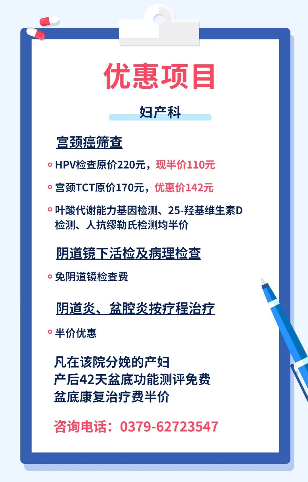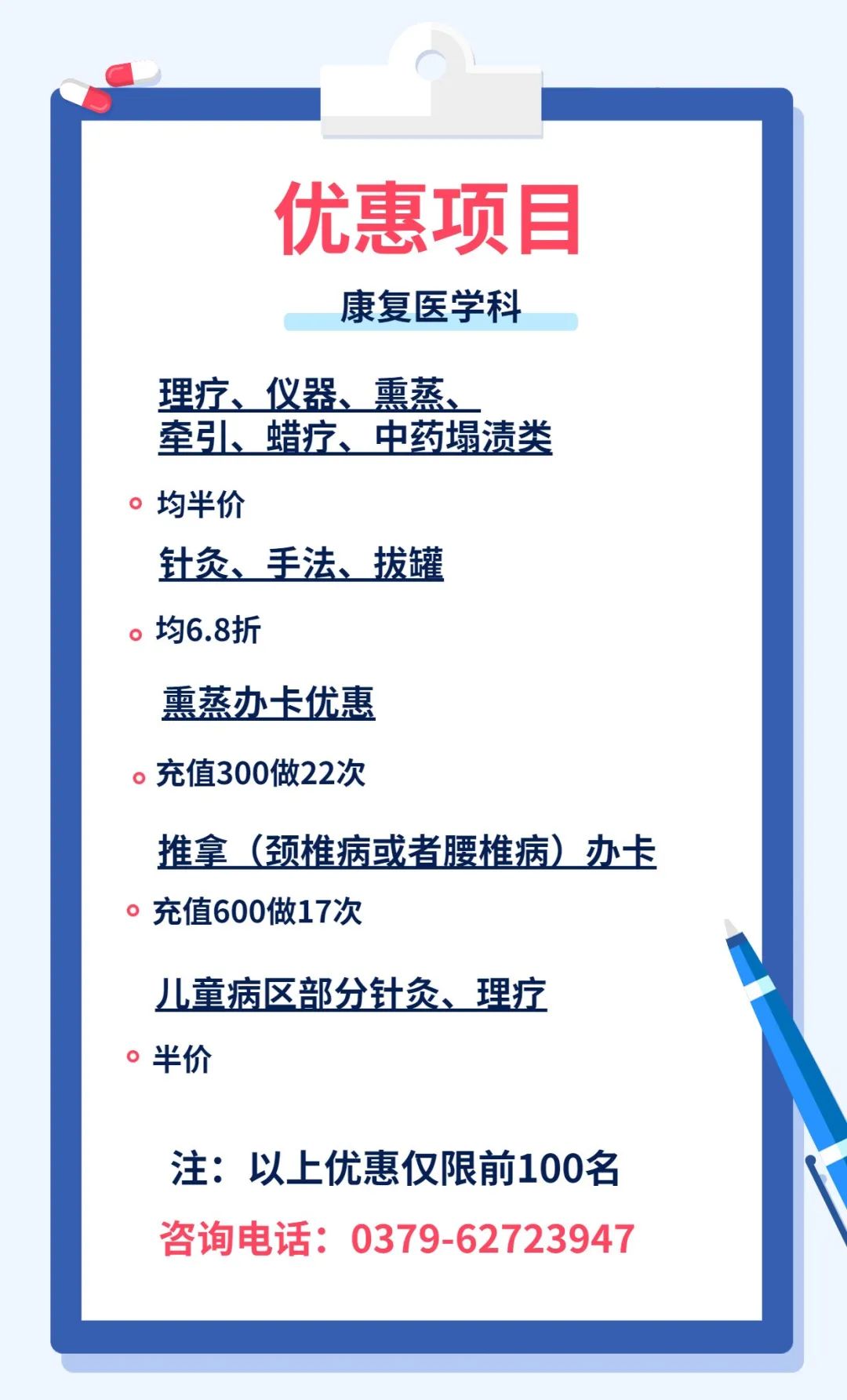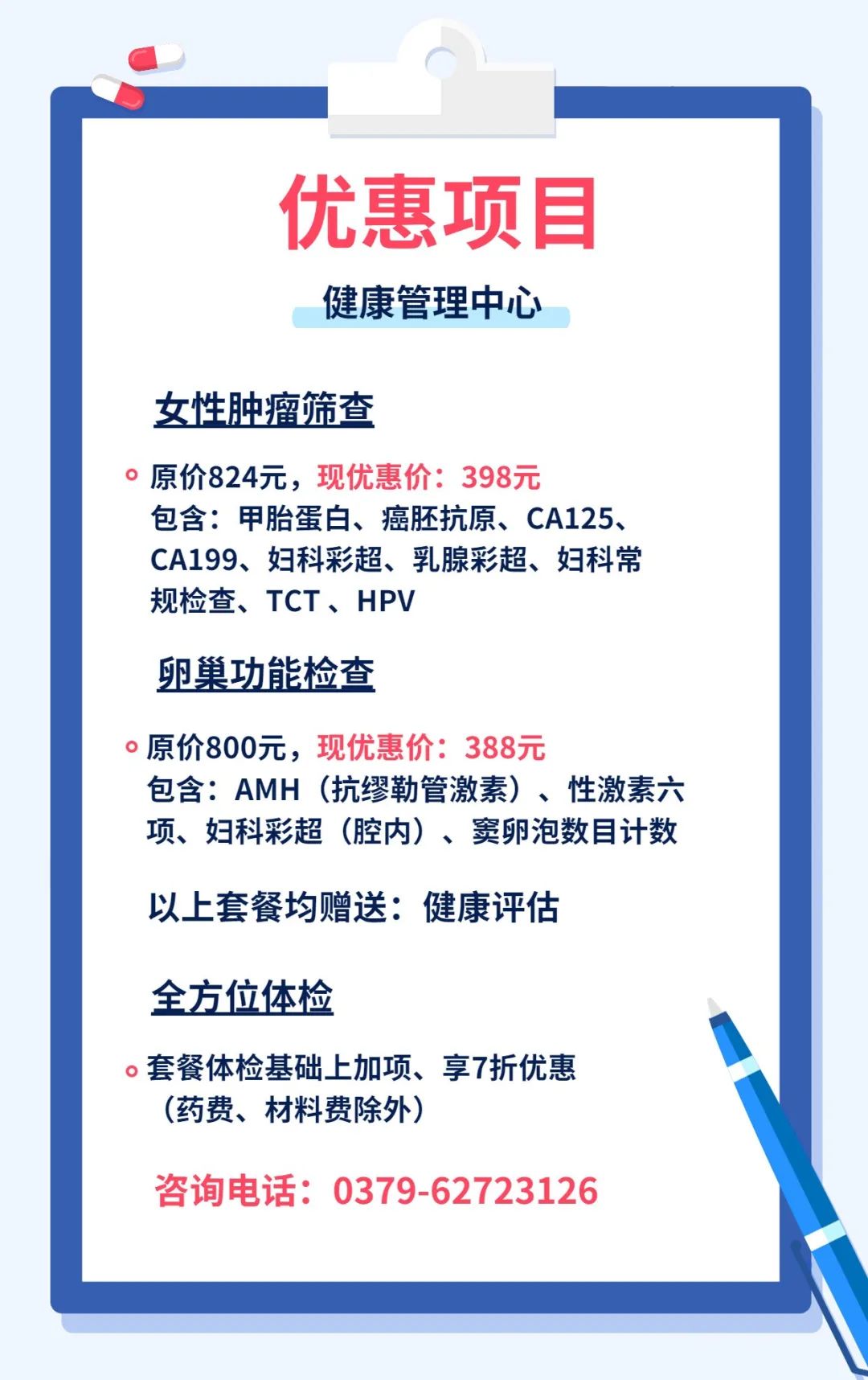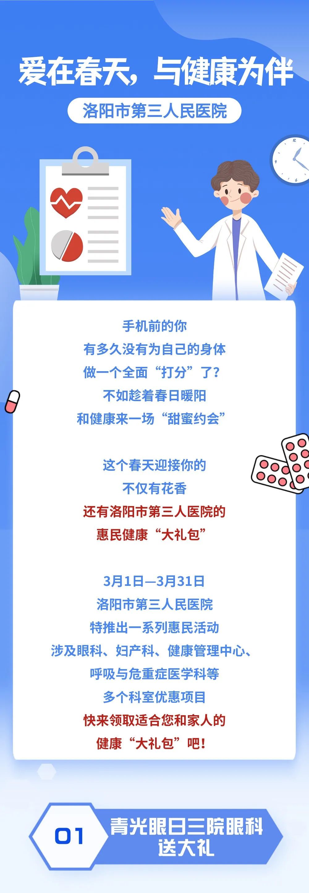除了眼科、妇产科推出优惠项目外,健康管理中心、康复医学科、呼吸与危重症医学科也推出了不少惠民项目,快来看看吧!