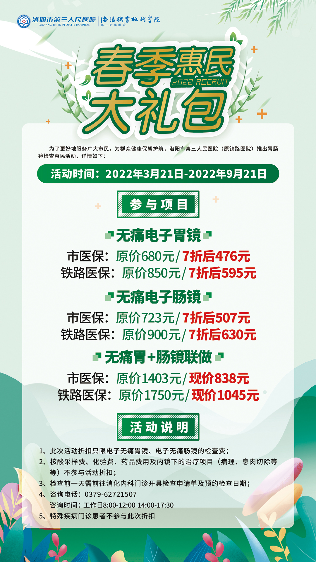 为了更好地服务广大市民,为群众健康保驾护航,洛阳市第三人民医院(原铁路医院)推出胃肠镜检查惠民活动,详情如下: