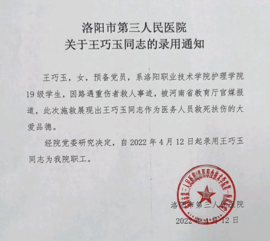 日前,洛阳职业技术学院护理学院学生王巧玉在实习上班路上,热心救助车祸伤者的事迹被报道出来。4月11日,洛阳市第三人民医院党委书记马伟从职业技术学院获悉此事,当天就召开了院党委会议,决定破格录用王巧玉,录用通知书已于今日发出。